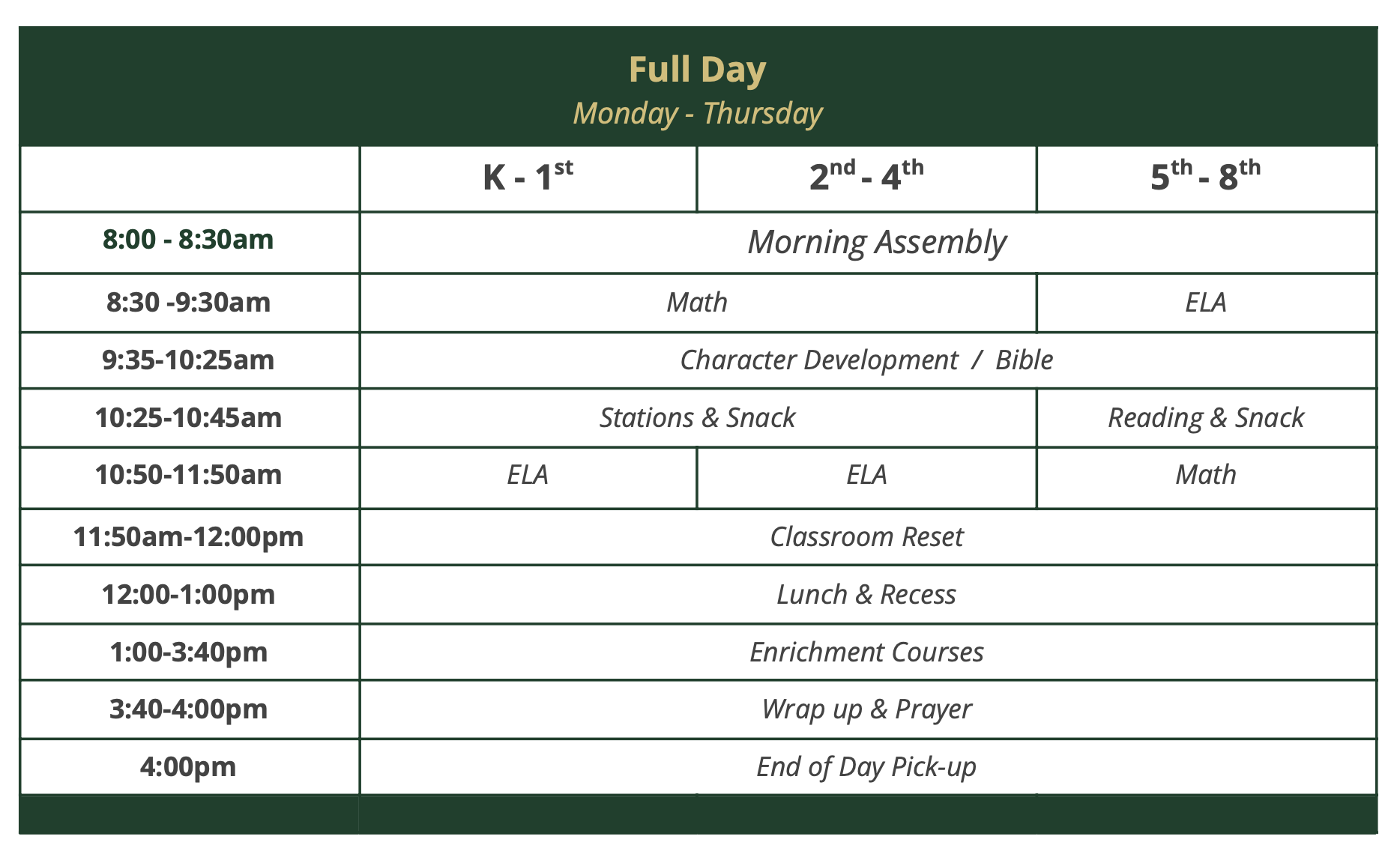 We meet for 34 weeks Monday – Thursday and the cost per child is: $7,700